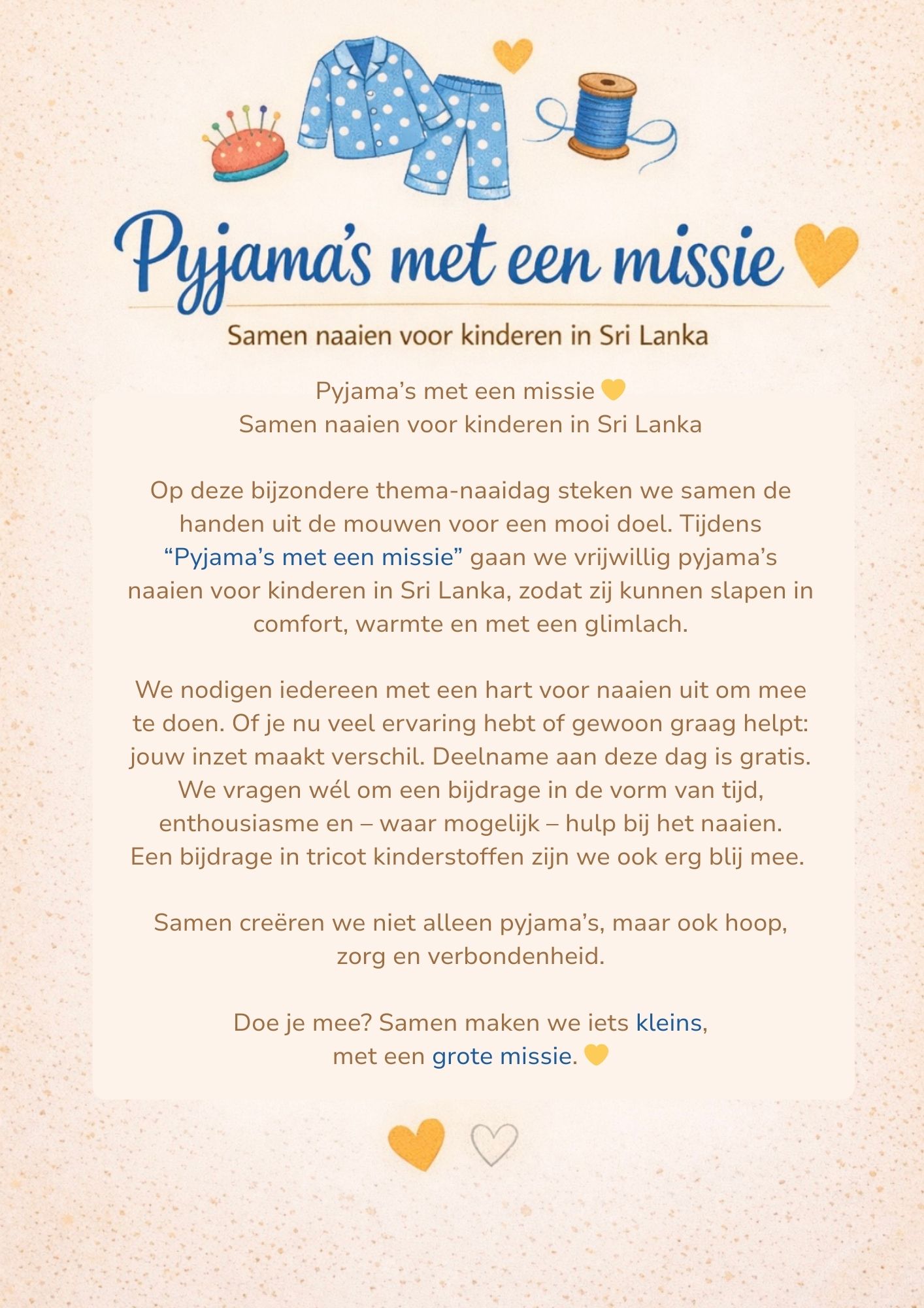 21 maart 2026 9.30-16.00 u Pyjama’s met een missie 💛, in samenwerking met Katja van Hekezen.
